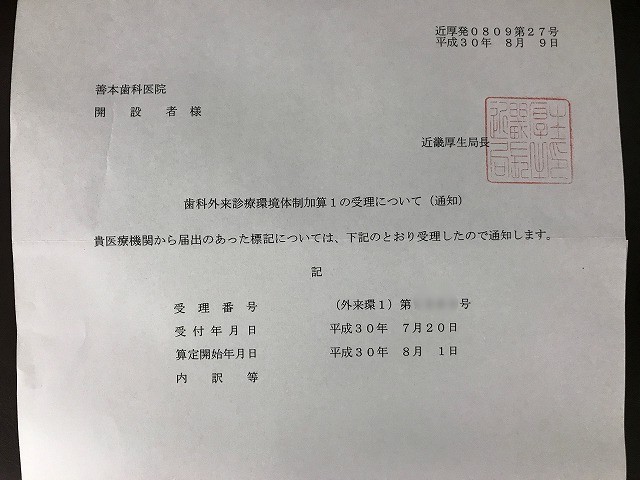 当医院は厚生労働省に歯科外来診療環境体制加算の届け出を行い承認・受理されました。