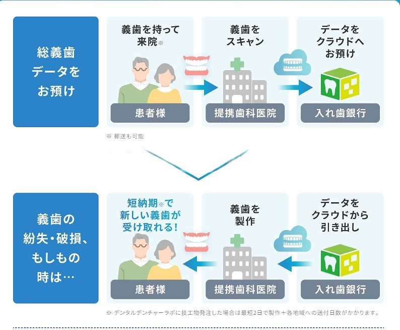 今お使いの入れ歯をスキャンしてそのデータを入れ歯銀行(クラウド)に預けておき、入れ歯を紛失した時とか、破損した時とか、災害に合われた時とかにそのデータを利用して今まで使用していたのと同じ入れ歯を作製するというシステムです。