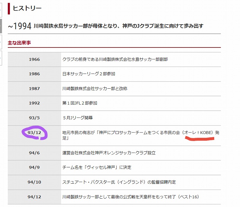 1993年12月に「神戸にプロサッカーチームを作る市民の会」オーレ!神戸発足と記されています。