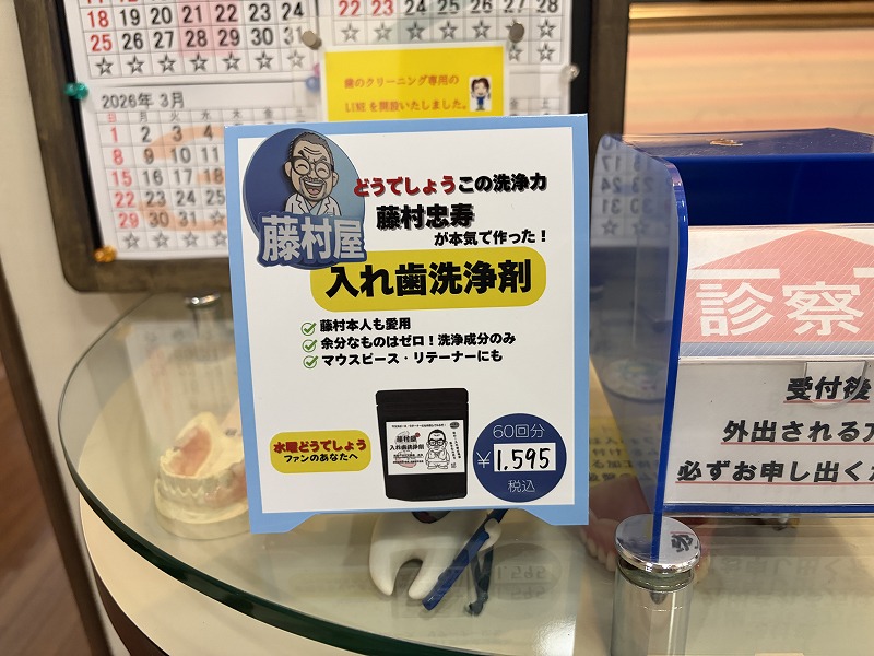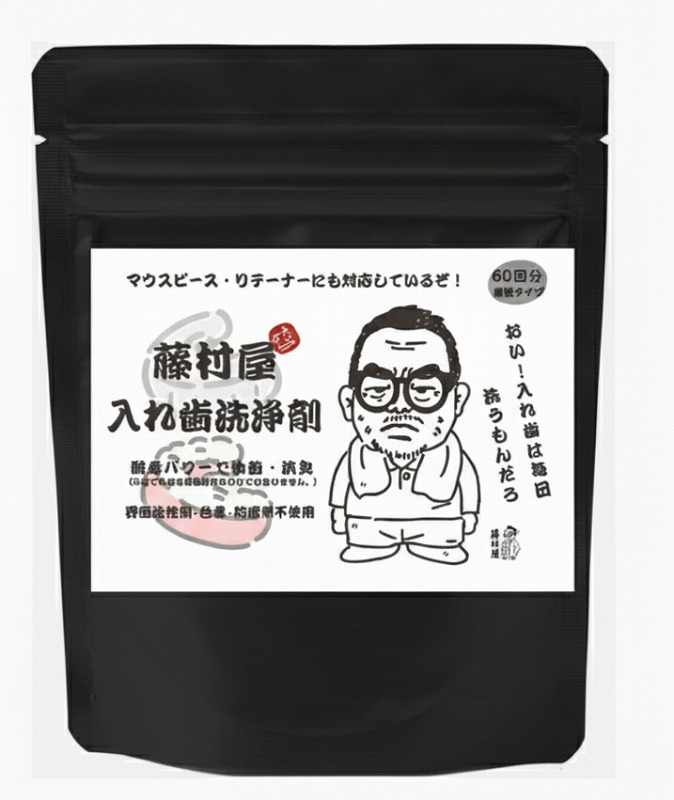 「藤村屋 入れ歯洗浄剤」は、藤村忠寿が実際に使用し、その体験をもとにパッケージデザインにも参画した、こだわりの洗浄剤です。