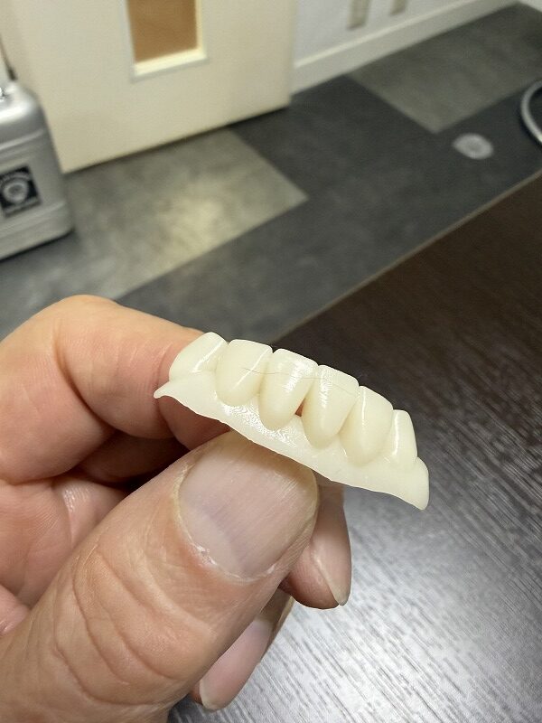 あくまでも旧義歯に増歯しての機能回復が主目的ですのでこのままでも良いのですが、今回は歯肉部分に色を付けて完成させました。